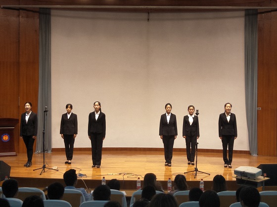在本次朗诵进行前,同学们首先选用了激昂传颂的名篇《党旗飘扬》,配以适当的激扬音乐,并每天都有一定程度的训练。比赛正式开始,我院选手朗诵内容充实、形式丰富多彩。朗读爱国诗歌时,成员们神情庄严,热情饱满,或深沉,或激昂的话语表达了作为华夏儿女的自豪,一语一顿中承载着敬爱,徘徊着缠绵,这份浓浓的情怀洋溢在成员们的吟诵声中。凝重的配乐中,吟诵者用精简的语言带领着我们走进诗人的心田, 去领悟大好河山,歌颂党德,引导同学们乐于奉献, 勇敢拼搏,以其铿锵有力的气势,充沛饱满的感情,自信大方的形象赢得老师和同学们的阵阵掌声。经过一个多小时的角逐,根据在场评委公平公正的评分,我院荣获二等奖。