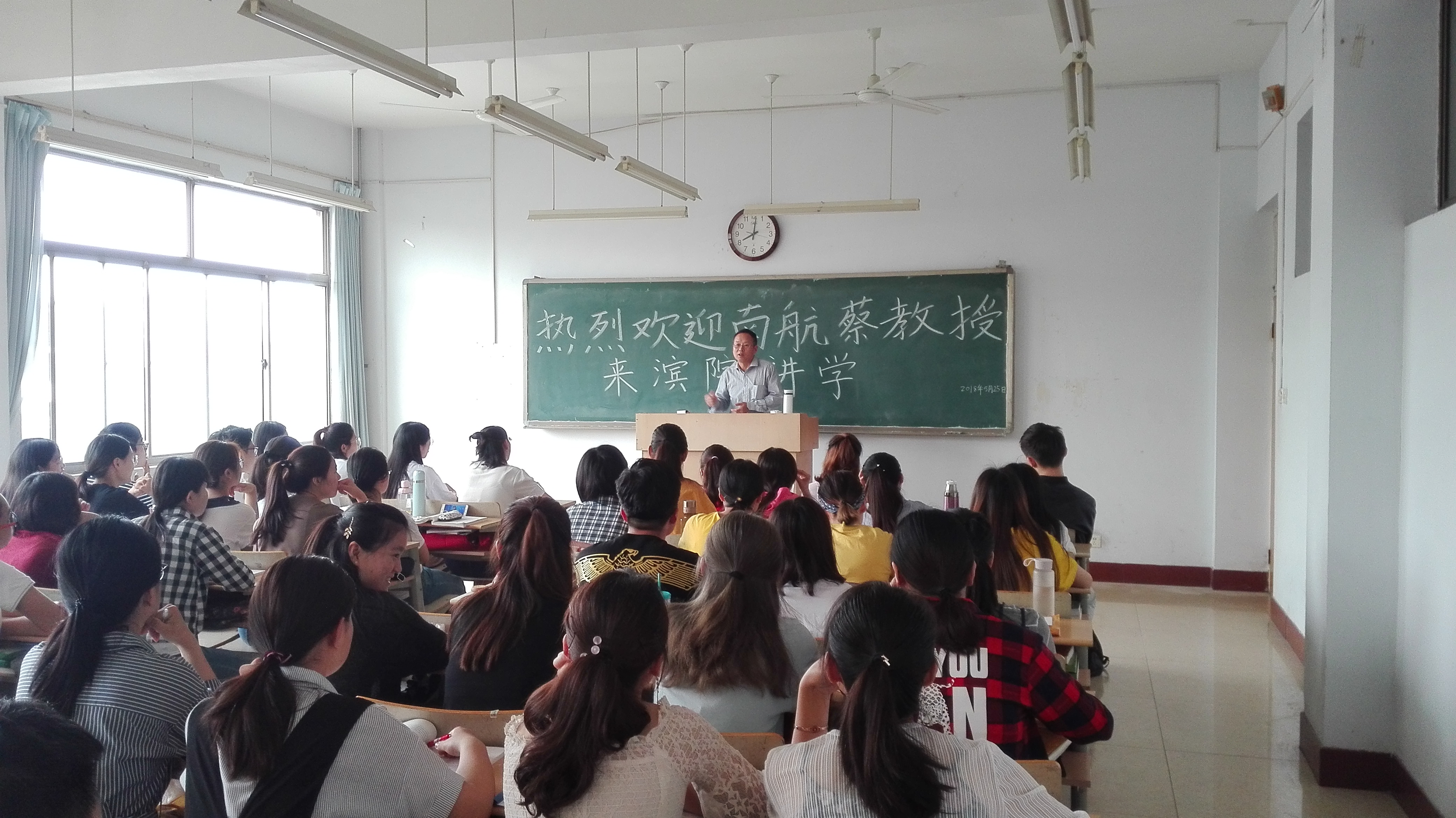 5月25日上午,南京航空航天大学蔡忠元兼职教授走进2016级商务英语本科一班的课堂,给学生讲了一场生动的民航英语(含翻译)课。