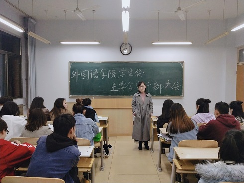 4月13日晚,我院于1号教学楼104教室召开了学生会主要学生干部大会,外国语学院学生科科长苏成荣及学生会副部以上成员参加了此次会议。