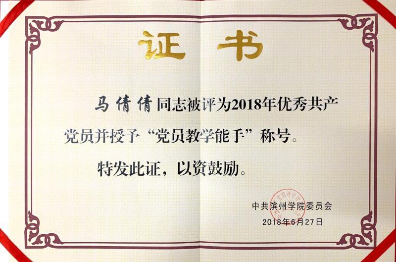 近日,本中心成员马倩倩讲师被评为优秀党员,并授予“党员教学能手”称号。