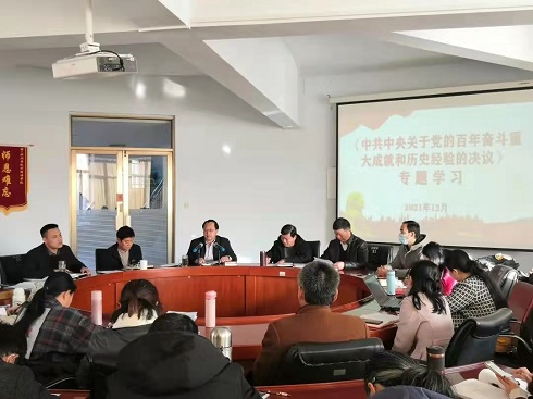12月7日下午,太阳成城集团tyc234cc党总支在201会议室组织召开全体教职工会议,集体学习了《中共中央关于党的百年奋斗重大成就和历史经验的决议》第四部分“开创中国特色社会主义新时代”全文内容。