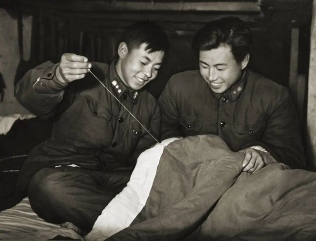 雷锋把帮助别人看成是自己最大的幸福。图为雷锋在为战友洗衣服。