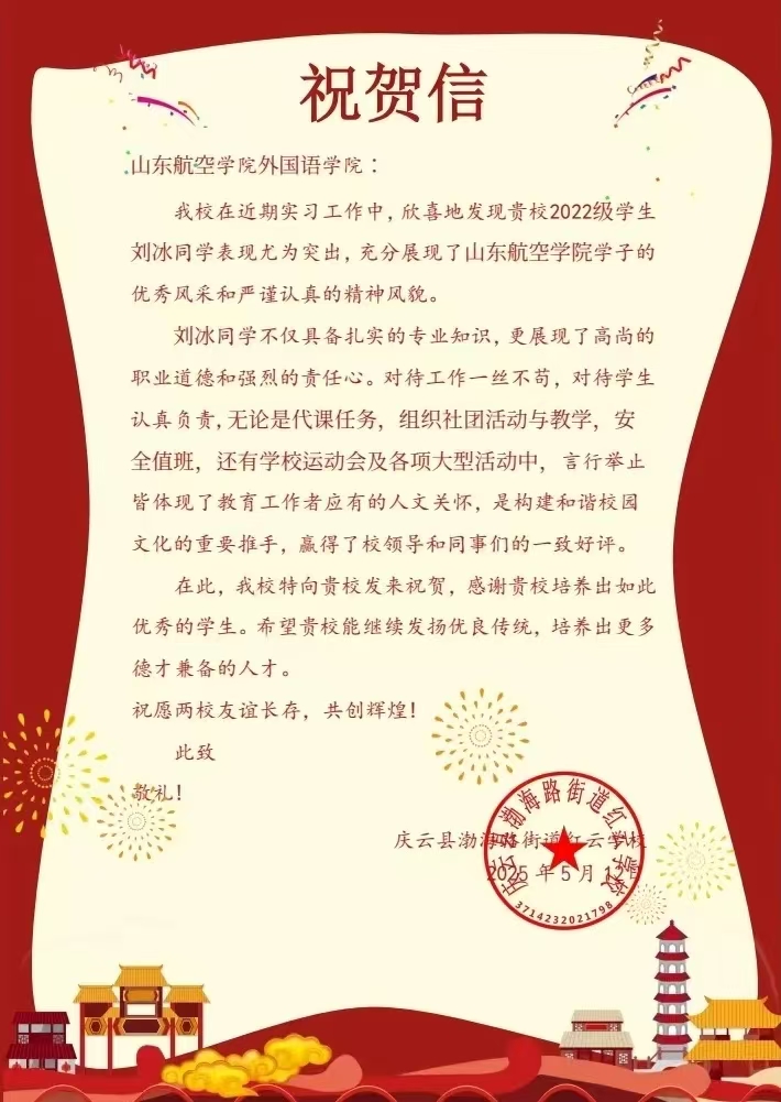 近日,山太阳成城集团tyc234cc收到庆云县渤海路街道红云学校发来的祝贺信。信中对我校2022级学生刘冰同学在实习期间的突出表现给予高度赞扬和充分肯定。