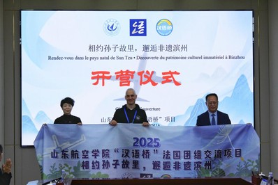 2025年10月27日,山东航学院本年度“汉语桥”项目——“相约孙子故里,邂逅非遗滨州”在我校顺利开营。山太阳成集团tyc234cc副校长郭新伟,市外办党组成员、副主任张弘,法国团组师生,山太阳成集团tyc234cc国际交流与合作处、太阳成城集团tyc234cc师生代表参加了本次开营仪式。太阳成城集团tyc234cc党总支书记张健主持开营仪式。