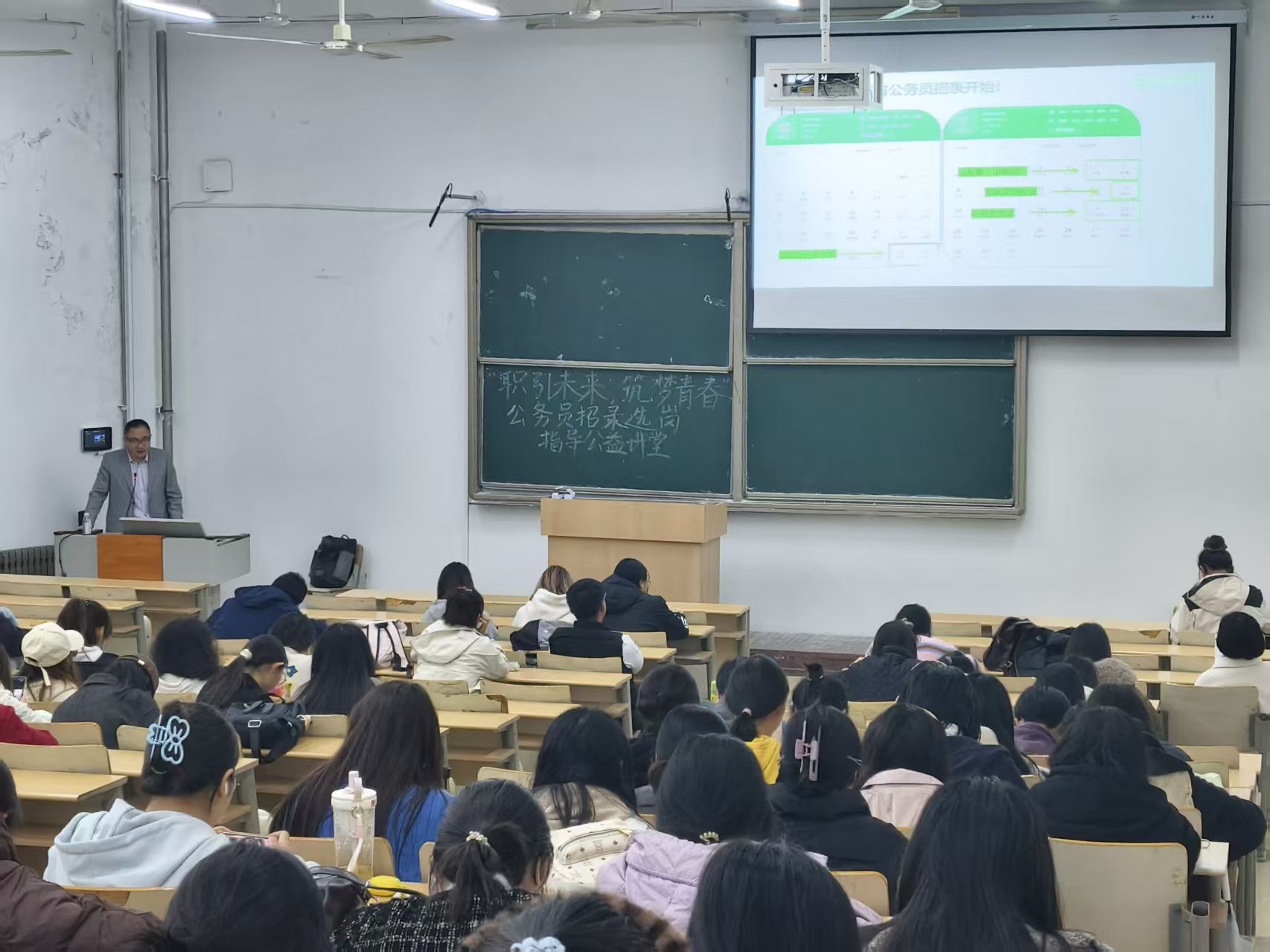 为助力有志于公职事业的学子精准把握考录政策、科学规划职业路径,11月7日,太阳成城集团tyc234cc邀请成公教育资深工作人员开展“职引未来·筑梦青春”公务员招录选岗指导公益讲堂,2026届部分毕业生和2027届全体毕业生参加。